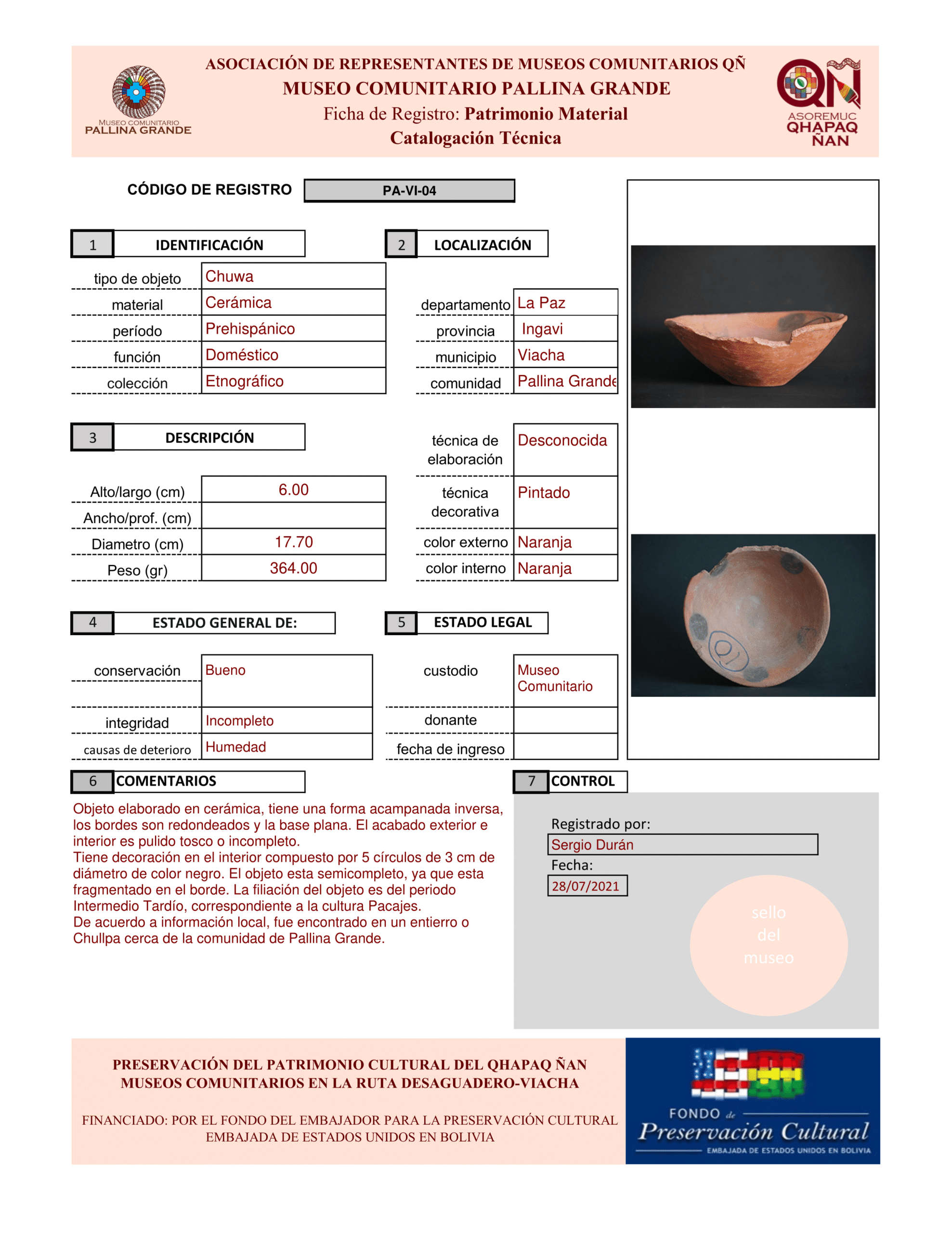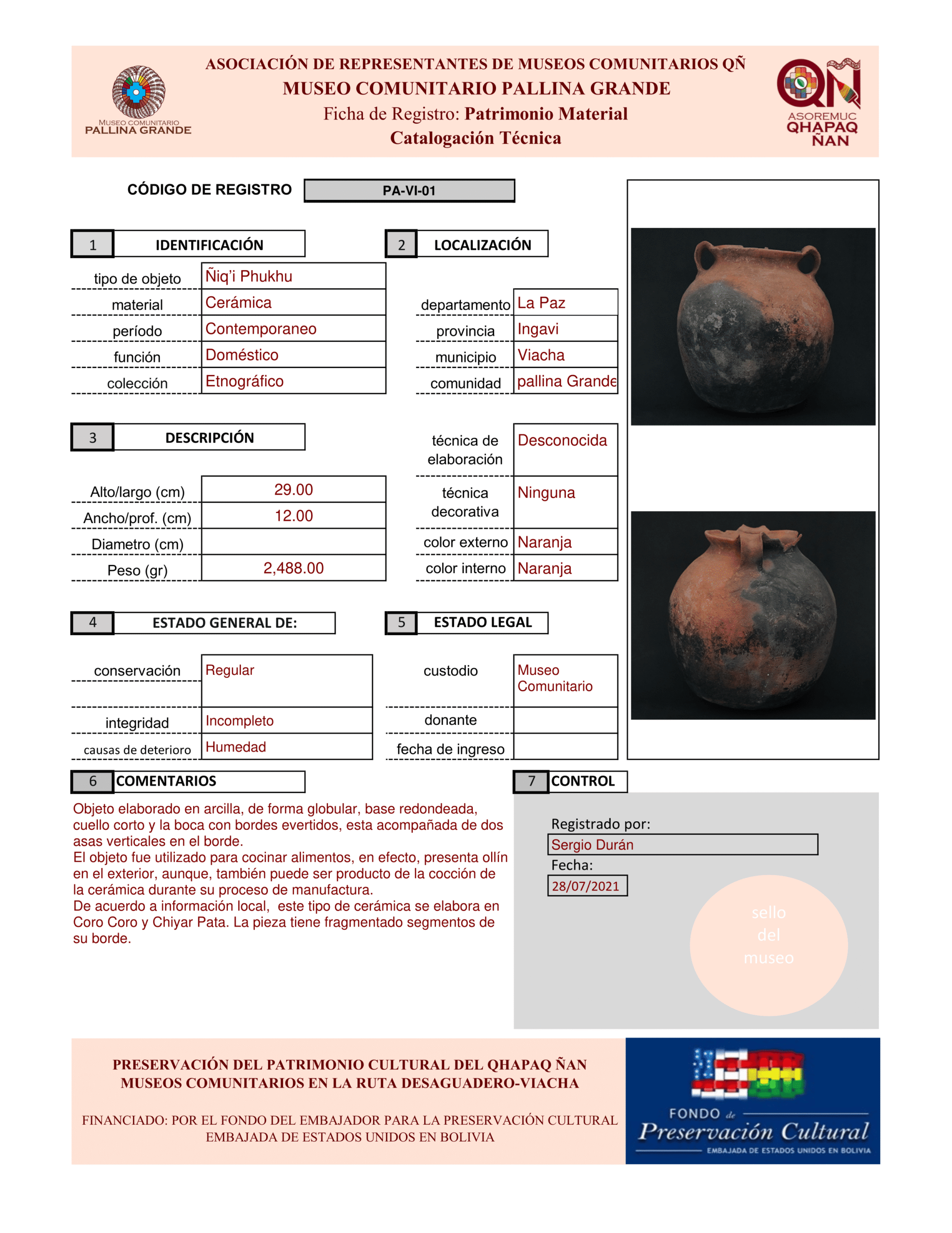 Asoremuc-QÑ realizó con sus especialistas, la Catalogación de Bienes Culturales identificados y aportados por las comunidades de Pallina Grande-Viacha, Chiripa-Taraco, Huancollo-Tiahuanacu, San Antonio-Guaqui, a los museos comunitarios.